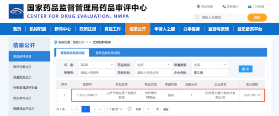 2022年8月31日,據(jù)中國國家藥監(jiān)局藥品審評中心(CDE)官網(wǎng)數(shù)據(jù)顯示,由杭州易文賽生物技術(shù)有限公司申報的“人臍帶間充質(zhì)干細胞注射液”獲批受理,受理號為CXSL2200409,擬開發(fā)用于呼吸系統(tǒng)疾病。