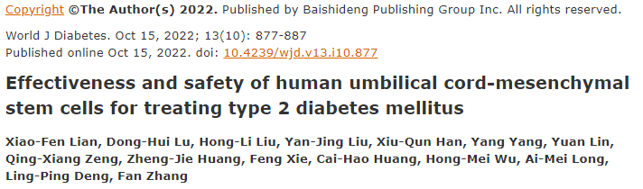參考資料:Lian XF, Lu DH, Liu HL, Liu YJ, Han XQ, Yang Y, Lin Y, Zeng QX, Huang ZJ, Xie F, Huang CH, Wu HM, Long AM, Deng LP, Zhang F. Effectiveness and safety of human umbilical cord-mesenchymal stem cells for treating type 2 diabetes mellitus. World J Diabetes 2022; 13(10): 877-887 [PMID: 36312002 DOI: 10.4239/wjd.v13.i10.877]