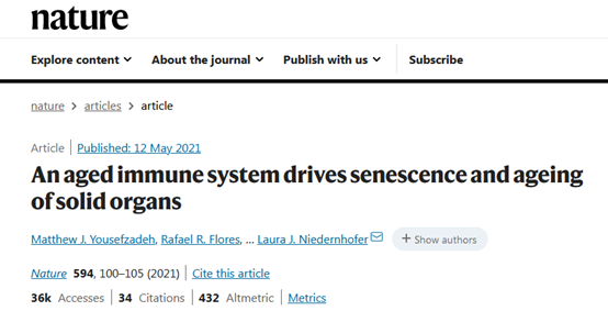 2021年5月12日,美國明尼蘇達大學醫(yī)學院的研究人員在國際頂尖學術期刊 Nature 發(fā)表了題為:An aged immune system drives senescence and ageing of solid organs 的研究論文。