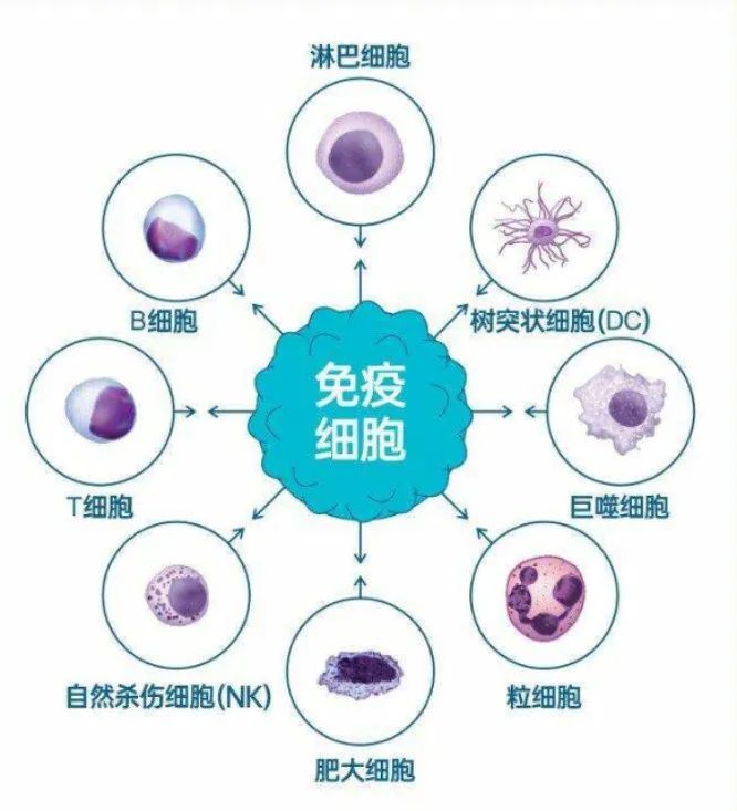 免疫細胞在人體發(fā)揮著消滅體內外有害物質及清除衰老、變性、死亡細胞的作用,被譽為人體的健康衛(wèi)士,包括淋巴細胞、巨噬細胞、NK細胞、DC細胞、粒細胞及肥大細胞等。