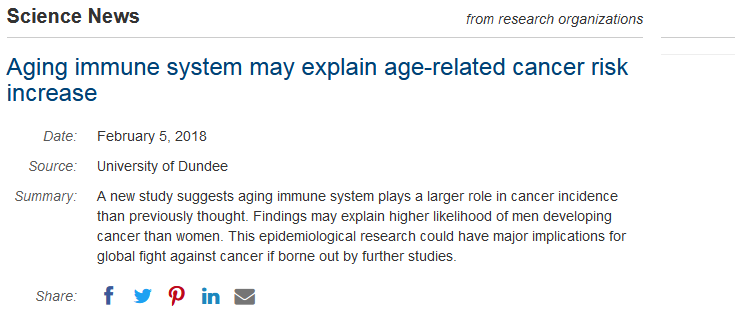 除此以外,鄧迪大學的Thea Newman教授課題組和赫瑞•瓦特大學、愛丁堡大學、法國Curie學院的科學家們也發(fā)現了癌癥發(fā)病率與衰退的免疫系統有很大的關系。