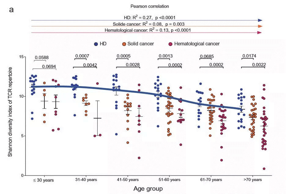 德國馬丁路德大學曾利用NGS測序技術(shù)研究了來自健康和癌癥患者的346份血液樣本中的T細胞(TCR)[3],獲得了大約880萬TCR數(shù)據(jù),他們發(fā)現(xiàn):40歲后,人體免疫細胞數(shù)量及功能開始大幅下降。