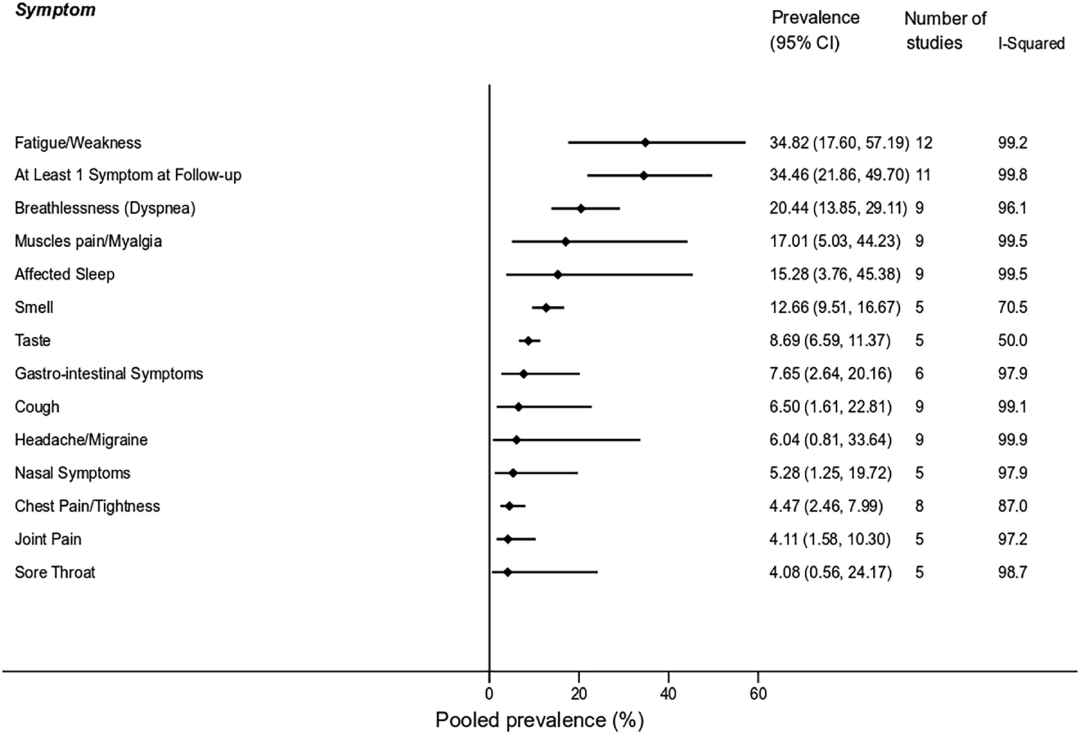無論是否住過院,在隨訪的4個(gè)月內(nèi)(平均126天),至少45%的新冠感染者仍存在一種及以上的癥狀;最普遍的五個(gè)癥狀分別是疲勞(28.4%)、疼痛/不適(27.9%)、睡眠障礙(23.5%)、呼吸困難(22.6%)和活動(dòng)受限(22.3%)。即使在非住院人群中,最常見的長(zhǎng)新冠癥狀依舊是疲勞,該比例高達(dá)34.8%(95%CI 17.6%-57.2%,12項(xiàng)研究)。