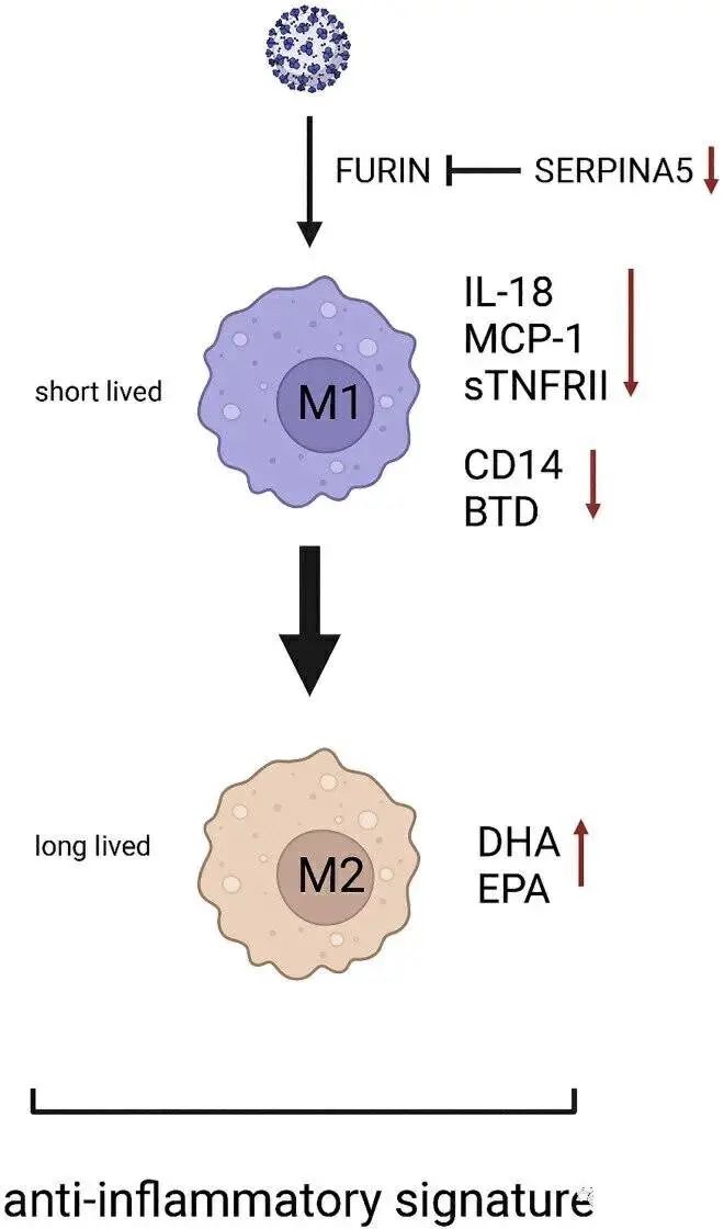而這一系列明顯的炎癥抑制分子特征,讓研究者不得不想到了:在長(zhǎng)新冠的患者體內(nèi),形成了交替極化的巨噬細(xì)胞