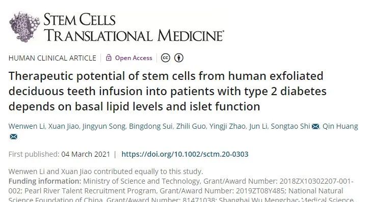 [1]Li, W, Jiao, X, Song, J, et al. Therapeutic potential of stem cells from human exfoliated deciduous teeth infusion into patients with type 2 diabetes depends on basal lipid levels and islet function. STEM CELLS Transl Med. 2021; 1– 12. https://doi.org/10.1002/sctm.20-0303