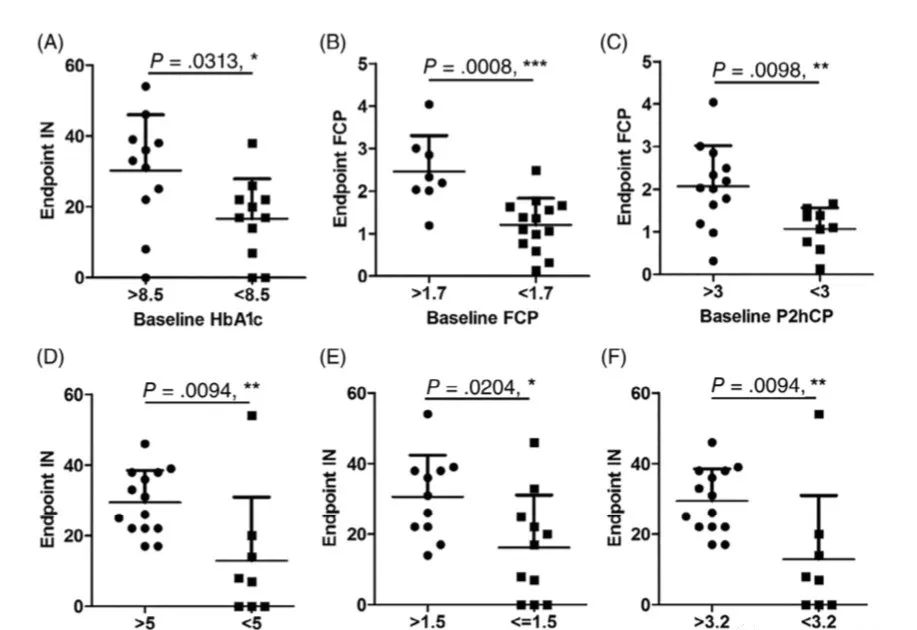 通過(guò)相關(guān)性分析發(fā)現(xiàn),干細(xì)胞移植前血糖水平與療效相關(guān);也就是說(shuō),HbA1c <8.5% 的入組患者在治療后顯著降低了每日胰島素劑量?;颊咧委熐耙葝u功能狀態(tài)與治療后胰島功能恢復(fù)程度密切相關(guān),F(xiàn)CP>1.7 ng/mL、P2hCP>3 ng/mL的患者治療后胰島功能恢復(fù)較好(圖 5B,C)。