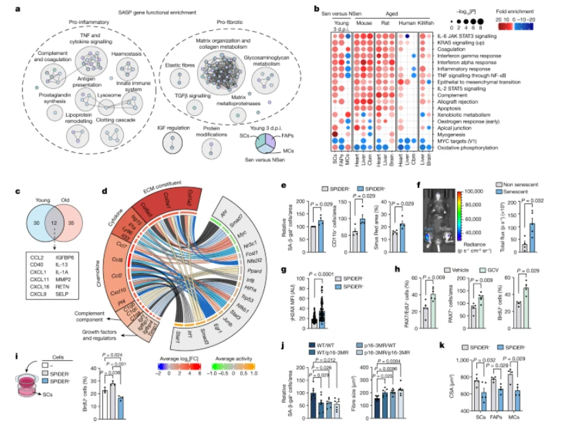 他們發(fā)現(xiàn),組織受損與年齡增長(zhǎng)都會(huì)產(chǎn)生衰老細(xì)胞,這些細(xì)胞雖然具有廣泛的異質(zhì)性,但其衰老相關(guān)分泌表型SASP擁有兩大共同特征——包括分泌促炎性因子和促纖維化因子。它們的存在創(chuàng)造了一個(gè)類似炎癥衰老的微環(huán)境,不但減少了肌肉干細(xì)胞的增殖,還影響周邊生態(tài)位細(xì)胞健康,進(jìn)一步傳播著衰老,阻礙著組織再生。