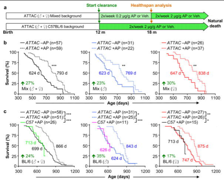 2016年,美國著名的梅奧診所就試圖清除小鼠體內(nèi)的衰老細(xì)胞,成功將小鼠的壽命延長(zhǎng)了約20-30%,相當(dāng)于人類年輕了幾十歲,并表現(xiàn)出腎臟功能增強(qiáng)、心臟耐受應(yīng)激、延緩腫瘤發(fā)生等效果。